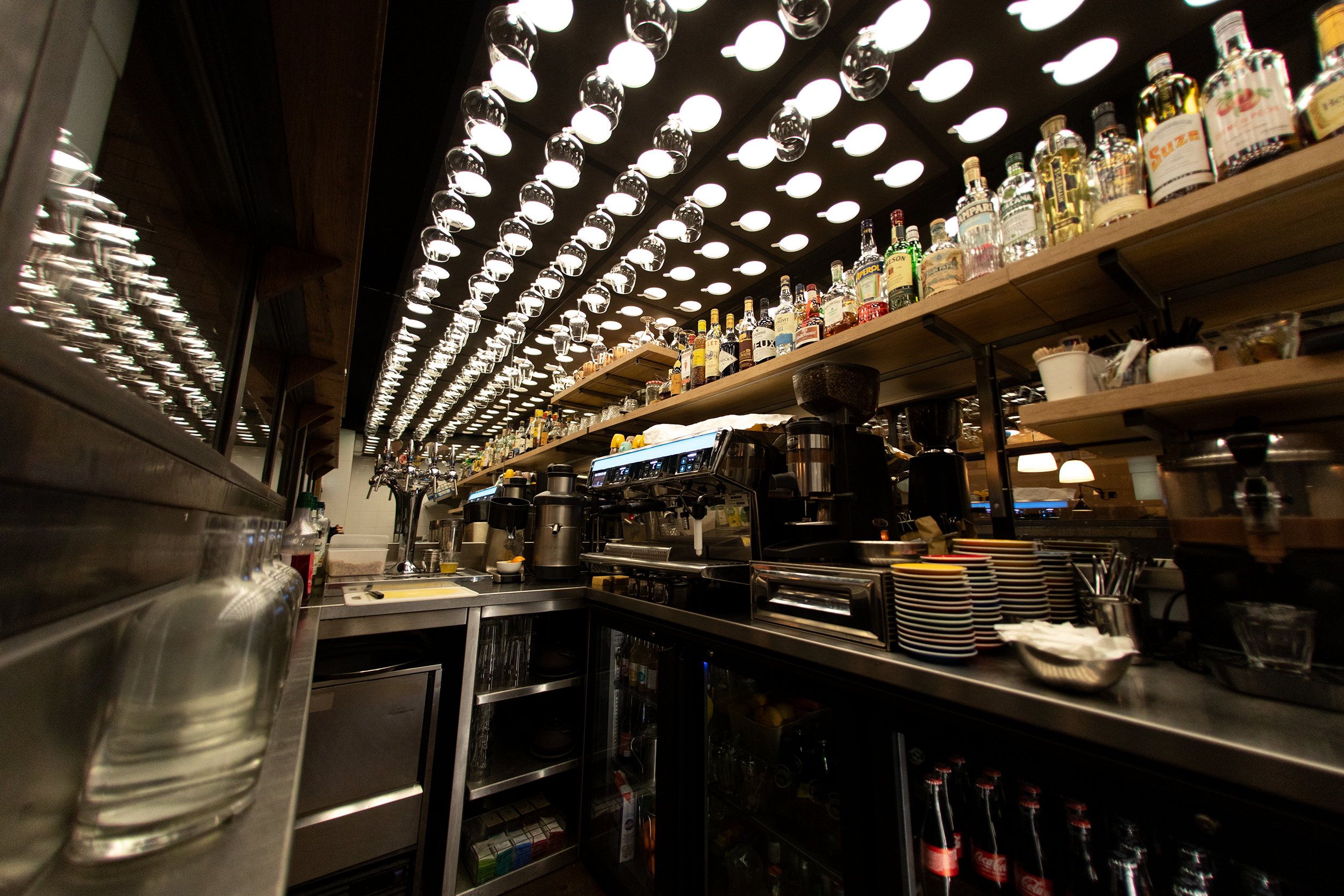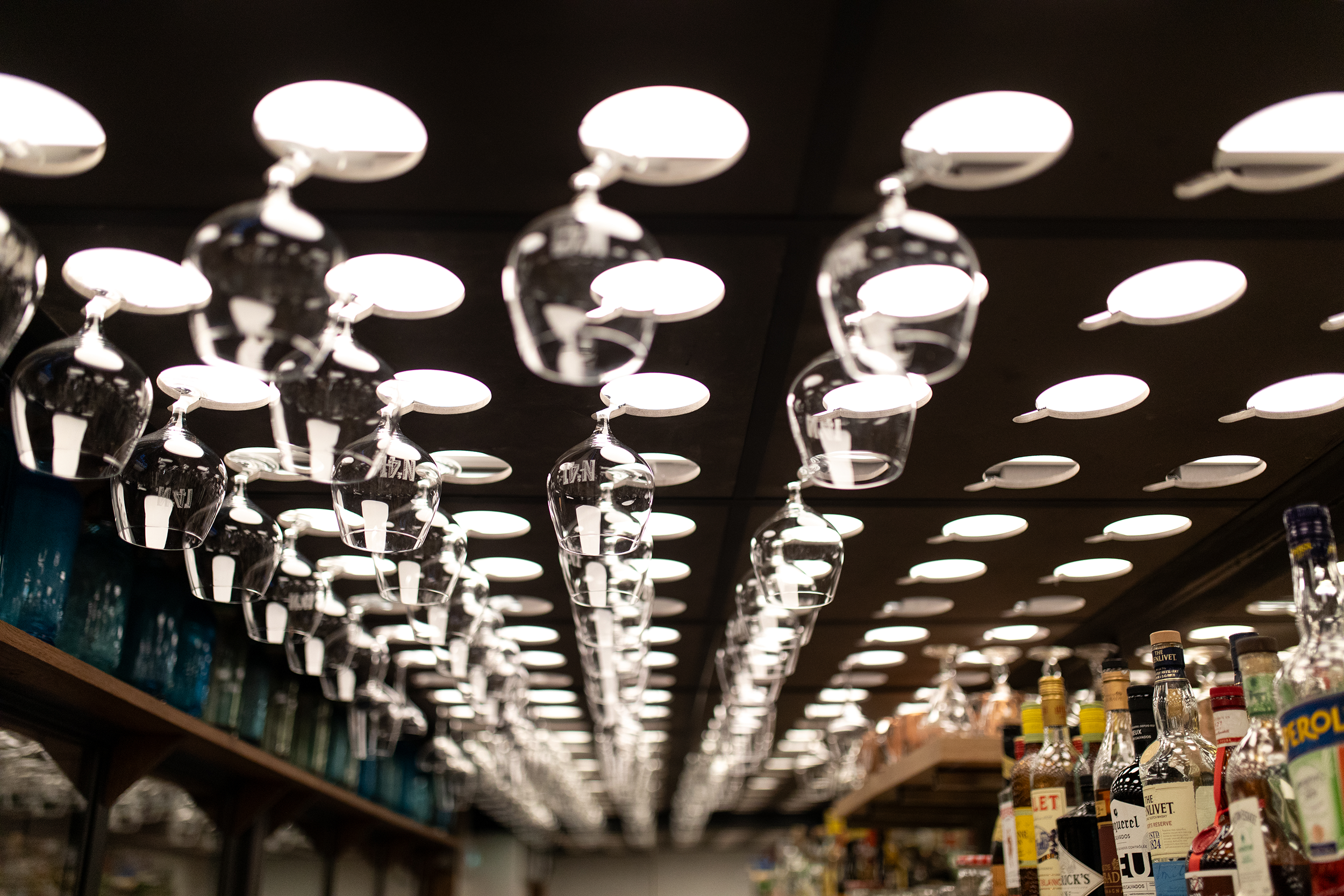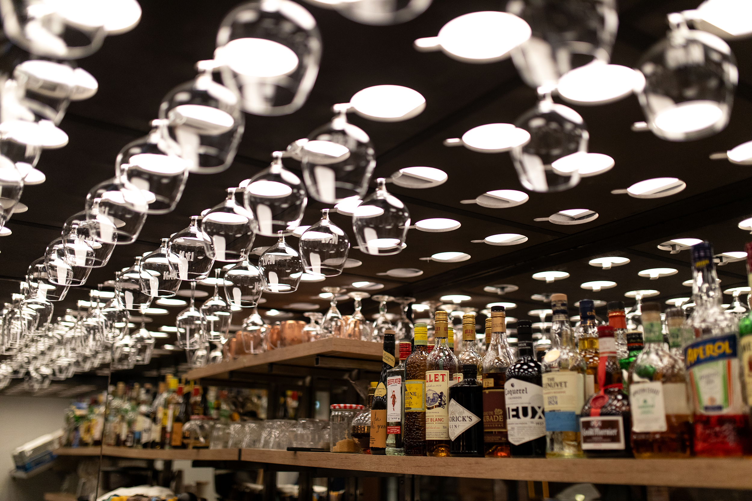 Le défi était de créer un rangement à la fois pratique et esthétique pour les verres à vin. Nous avons choisi d’exploiter la hauteur de cet espace bar, où notre bureau d’étude a créé cette fixation lumineuse.